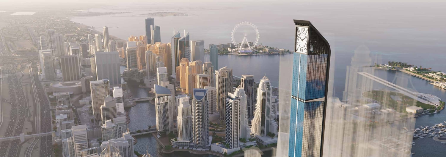 Franck Muller Aeternitas Tower at Dubai Marina is the first tallest clock tower in the world developed by London Gate with branded 1 to 4-bedroom apartments. With impressive height of 450 meters, it is the tallest branded residential tower. The tower's unique design, characterized by an angular structure and a captivating clock displaying numbers in various sizes, promises to redefine the Dubai skyline. This collaboration marks debut in real estate, a testament to the brand's commitment to innovation and excellence.