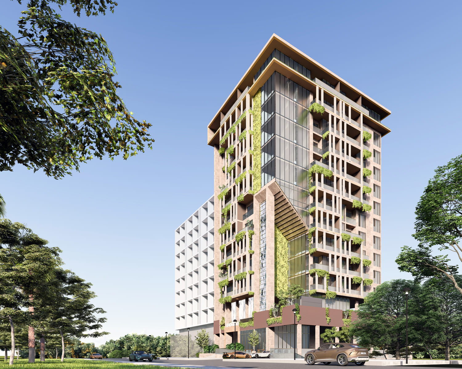 Amazonia Residence presents a perfect blend of contemporary design and natural integration, offering srudios, 1- and 2-bedroom apartments alongside luxurious 3-bedroom penthouses. This residential project stands out with its striking brick-red façade, accentuated by warm wooden elements and sleek glass railings that exude modern sophistication. Thoughtfully integrated greenery enhances the serene ambiance, seamlessly merging the building with its natural surroundings. The harmonious combination of materials and landscaping creates an inviting, sustainable living environment that is both visually stunning and environmentally conscious.