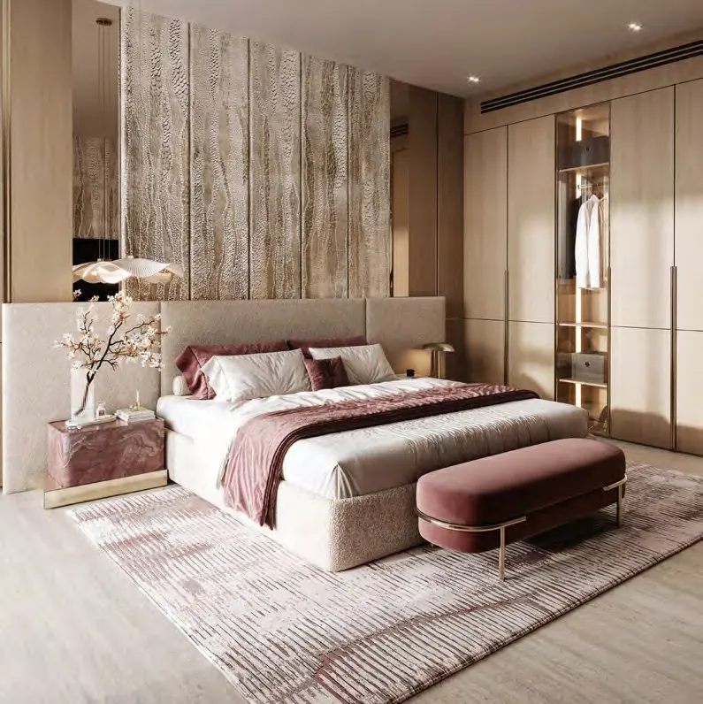 Interiors are finished with a curated palette of natural and premium materials. Flooring features stone travertine, complemented by marble feature surfaces and fluted oak wood elements in both natural and painted finishes. Walls incorporate white painted surfaces, wood paneling, and selected feature wallcoverings, while metal accents are executed in bronze tones with tinted bronze mirrors. Kitchens are seamlessly integrated into the living spaces with bespoke cabinetry and refined stone finishes, and residences are delivered with carefully selected built-in furniture elements that reflect the project’s emphasis on understated elegance and material integrity.