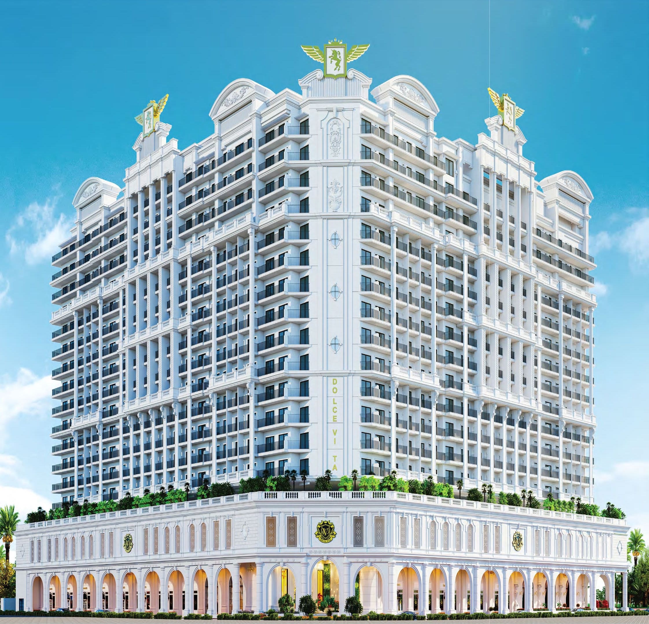 Dolce Vita by Vincitore is an architectural ode to Italian grandeur nestled in the heart of Arjan, Dubai. Its stately façade, inspired by royal Victorian design and Classic Italian craftsmanship, evokes elegance through elements like arches, columns, and panoramic windows. The structure stands as a refined testament to luxury, blending traditional European design with modern comfort — creating a signature landmark in Dubai.