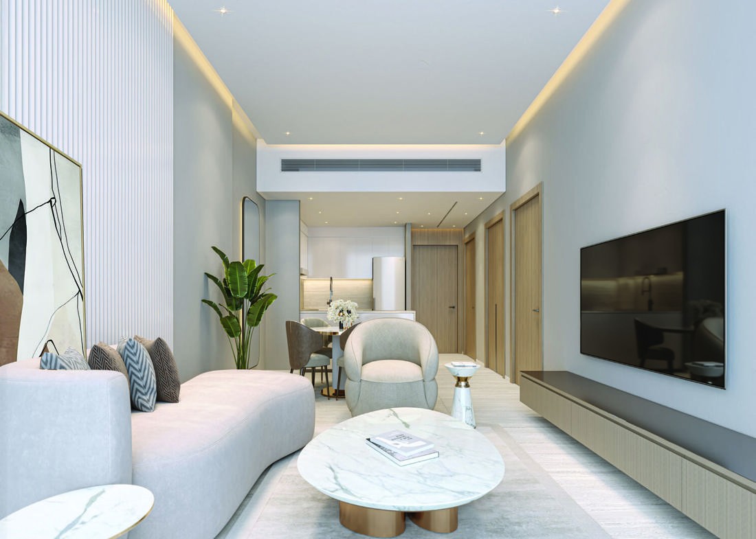 Walls are adorned with wood veneer, brown-tinted glass, and special white paint, complemented by elegant wall art in brown wood and bronze tones. The apartments feature flooring in crema marble and reflective marble with warm bronze and stainless steel accents, creating a harmonious blend of textures. Kitchens and bathrooms are crafted with travertine marble and luxury mixers.