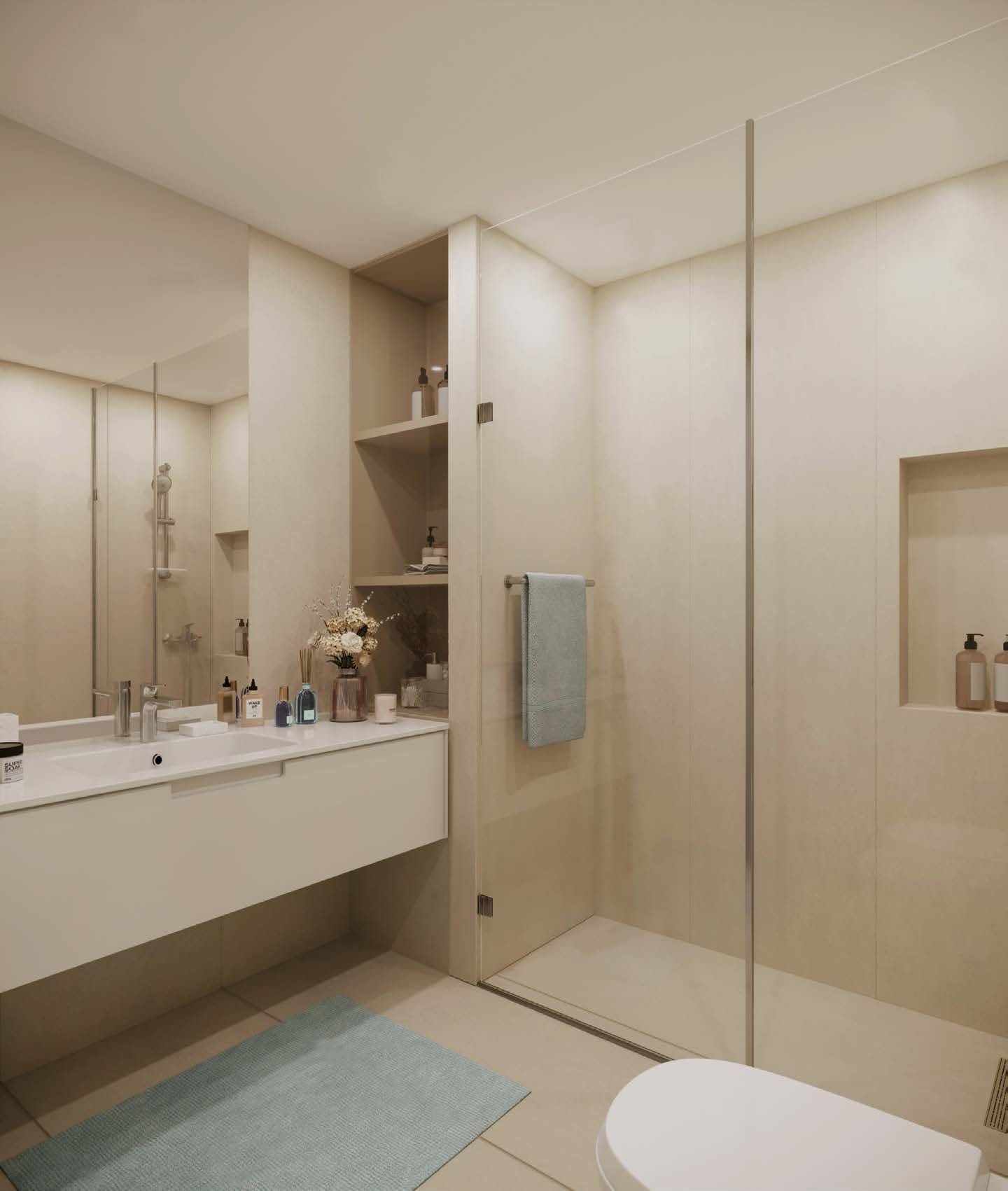 The interior design of your apartment matches the exterior splendour of the building, with plenty of finishing touches designed to add to your enjoyment. Modern bathrooms reflect thoughtfulness in their everyday use, from the built-in shelving and roomy drawers and cabinets to the polished tile surrounding the shower.