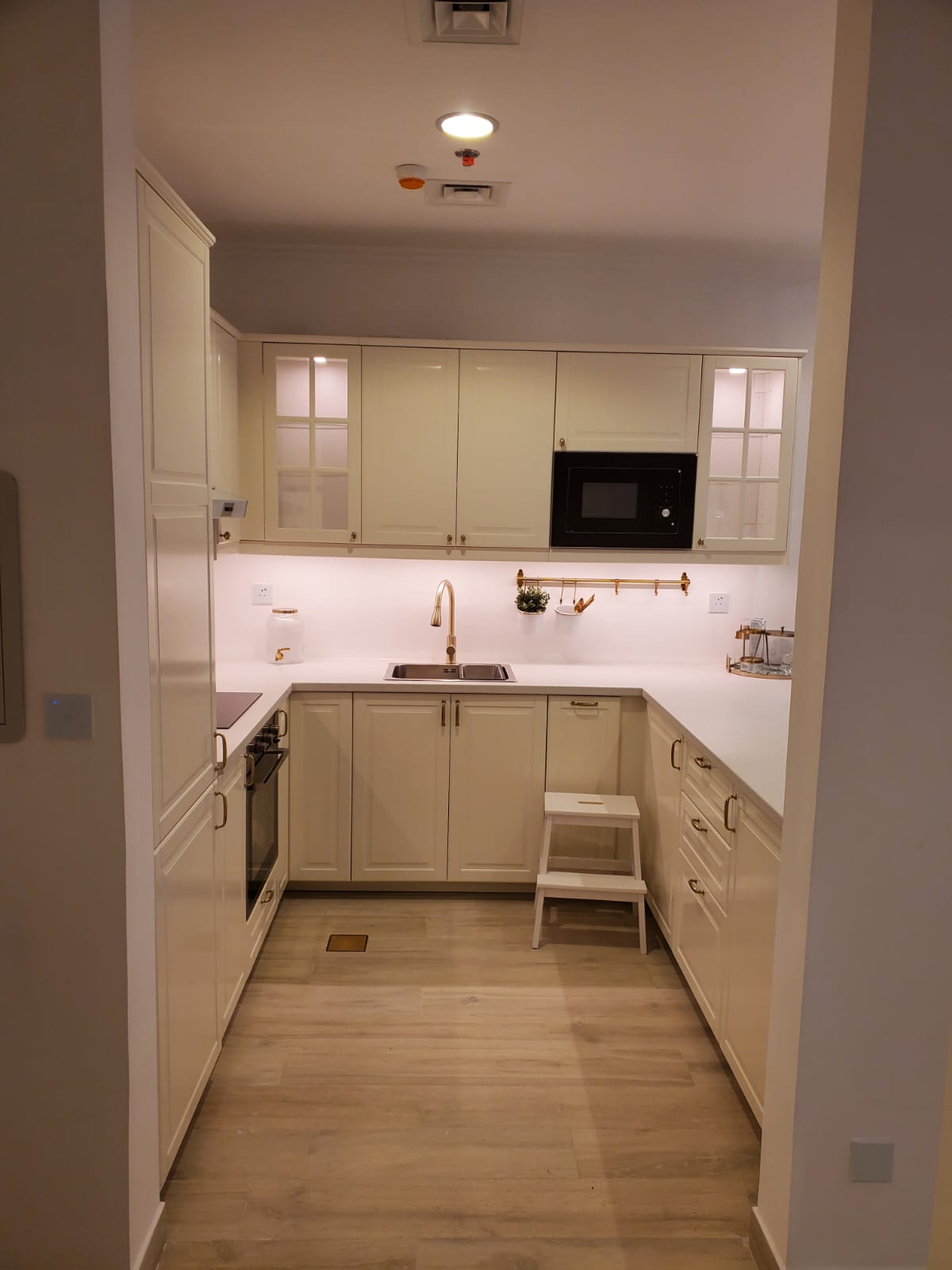 Kitchen with a suite and appliances (refrigerator, washing machine, microwave, stove)