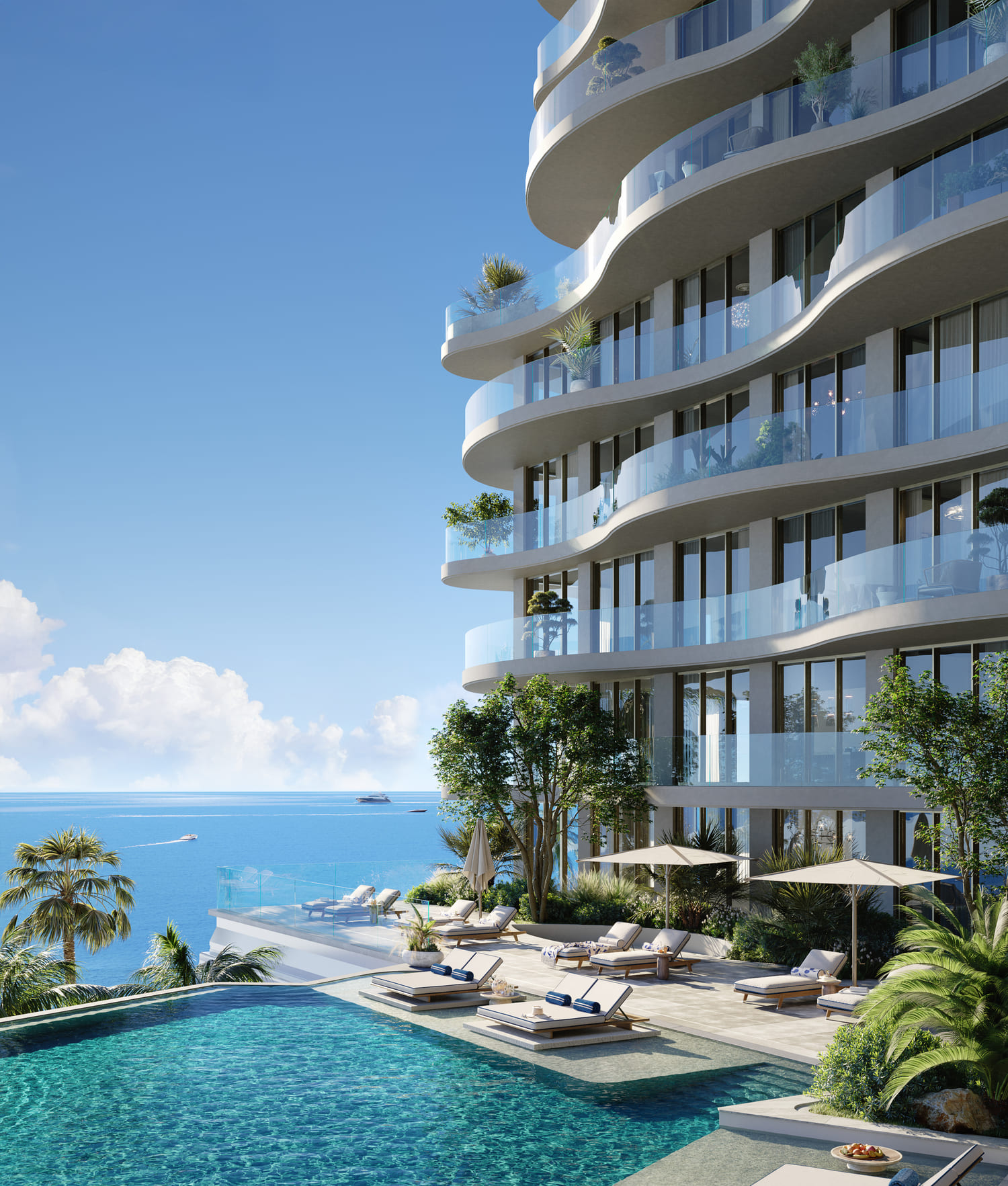 Miraggio is a sculptural architectural masterpiece set on the shores of Al Marjan Island, Ras Al Khaimah. Inspired by the movement of the sea and the tranquility of nature, its cascading terraces and curved façade seamlessly blend with the surrounding landscape. The building invites residents into a space of calm and timeless elegance — where every moment is shaped by the rhythm of the ocean, the warmth of the sun, and the organic flow of design. More than a residence, Miraggio is a sanctuary of art, architecture, and sensory well-being.