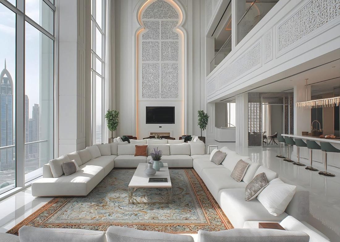 Modern finishing with high-quality materials. Light brown/tan fabric for furniture. White paint for walls and ceilings. Decorative luxury wallpaper with a white and beige pattern. Dark brown wood used for wall art. Light beige fabric for furniture. Light cream-colored marble for flooring