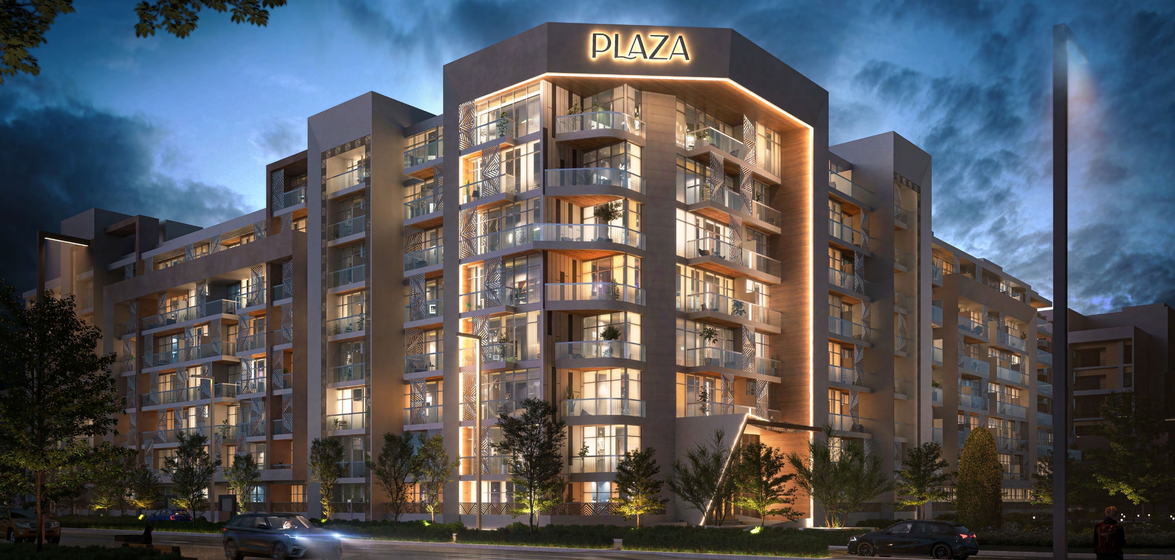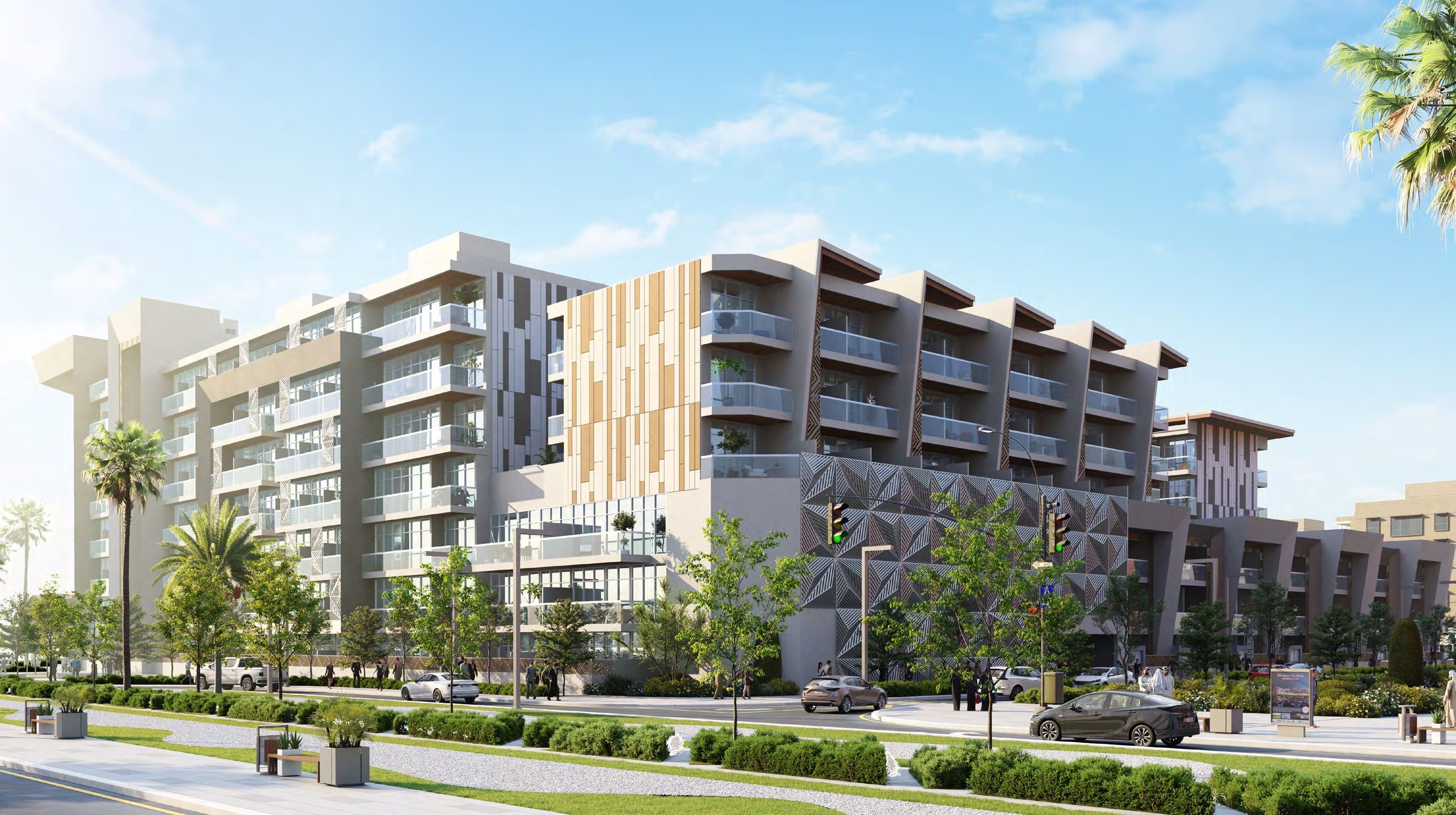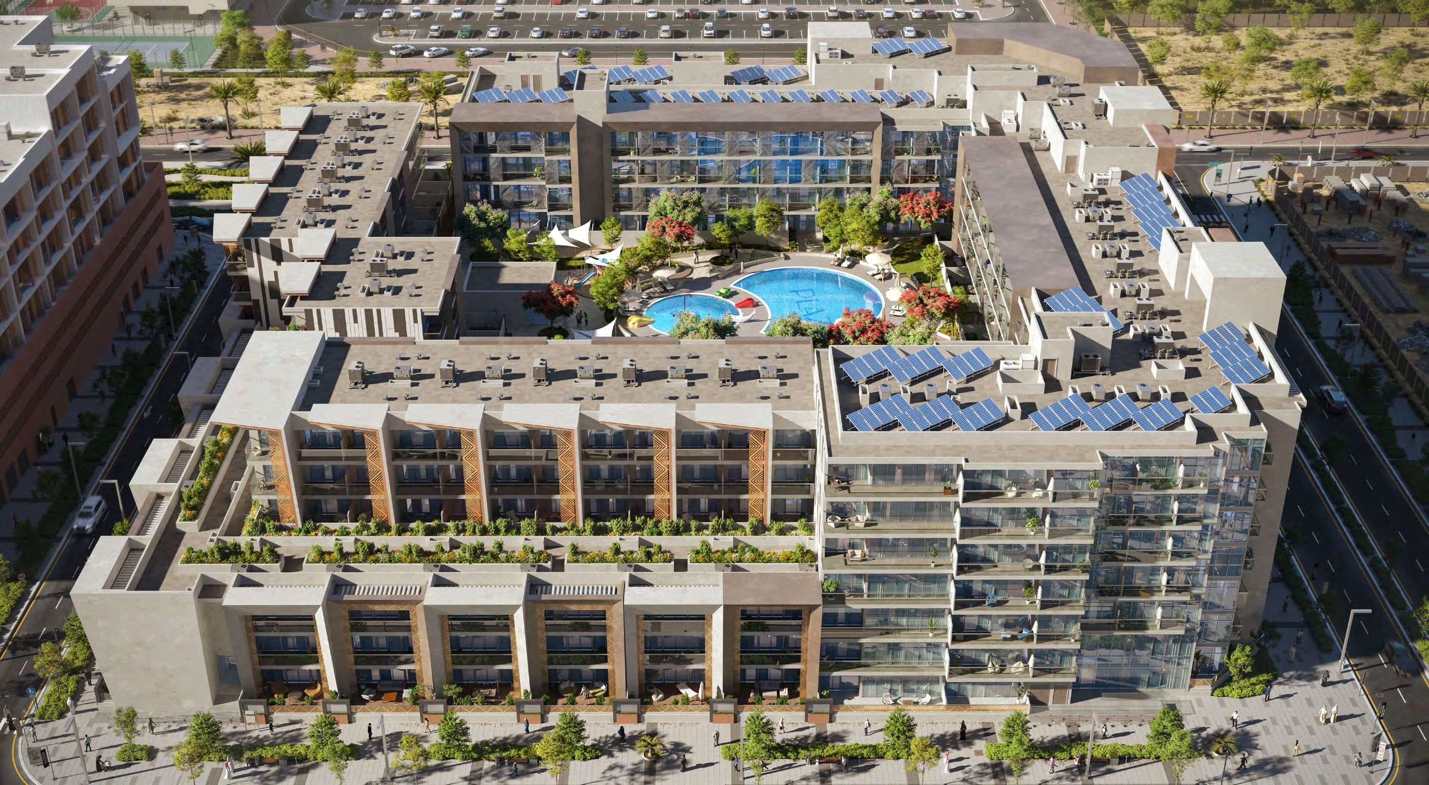 Harmoniously blending yet distinguished, Plaza is skilfully designed to echo the theme and spirit of the city. This high-end residential complex with Energy Efficient buildings brilliantly achieves sustainability with its dedicated solar panels and renewable energy sources. In a pure man- ifestation of masterful architecture, Plaza vividly reflects the modern Arabian theme of the city, with flawlessly designed facades decorated with a soft touch of Arabesque pattern. The square-shaped complex harmoniously embraces the serene views of landscape and the tur- quoise swimming pools, offering a home with equal share of sunlight and a living experience to look up to.