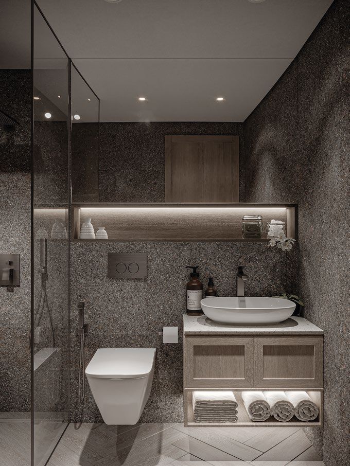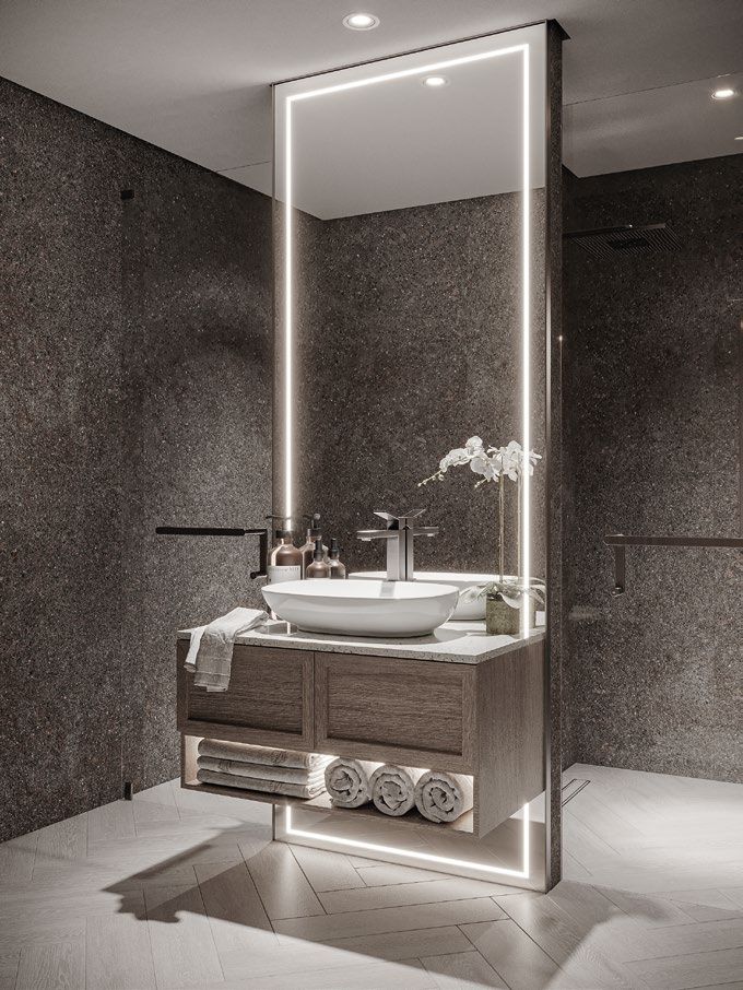 The bathroom gives off a classy yet comfortable feel with the textured walls complimenting the beautiful custom marble finish.