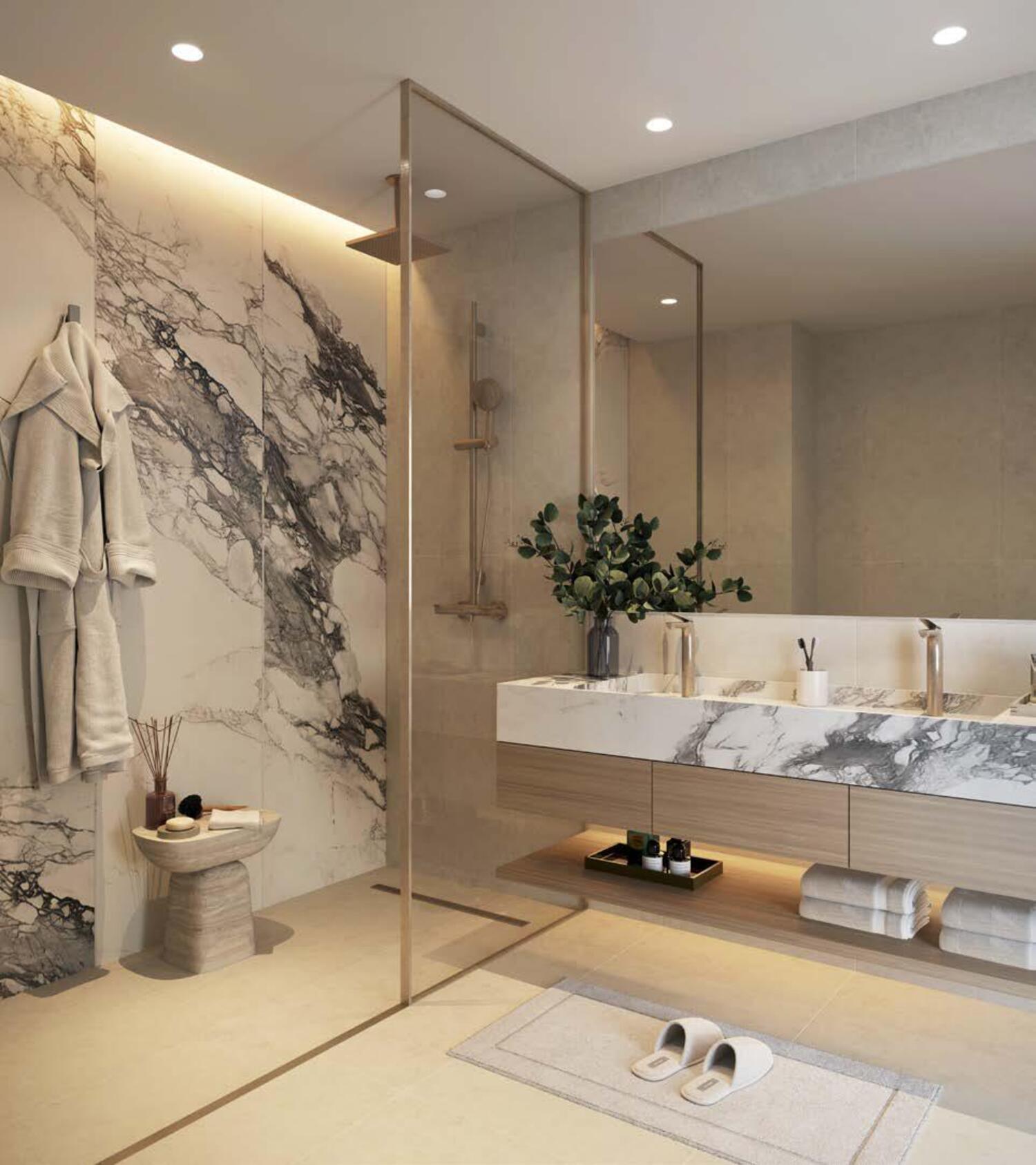 Inside the residences, thoughtful design meets understated elegance. From studios to spacious three-bedroom apartments, each unit is curated to reflect calm sophistication through soft neutral tones, natural textures, and high-quality finishes. Light and dark interior palettes offer timeless appeal, while built-in details like wardrobes with organizers and serene, minimalist bathrooms enhance both comfort and style. Every space is designed to feel effortlessly welcoming and luxuriously livable.
