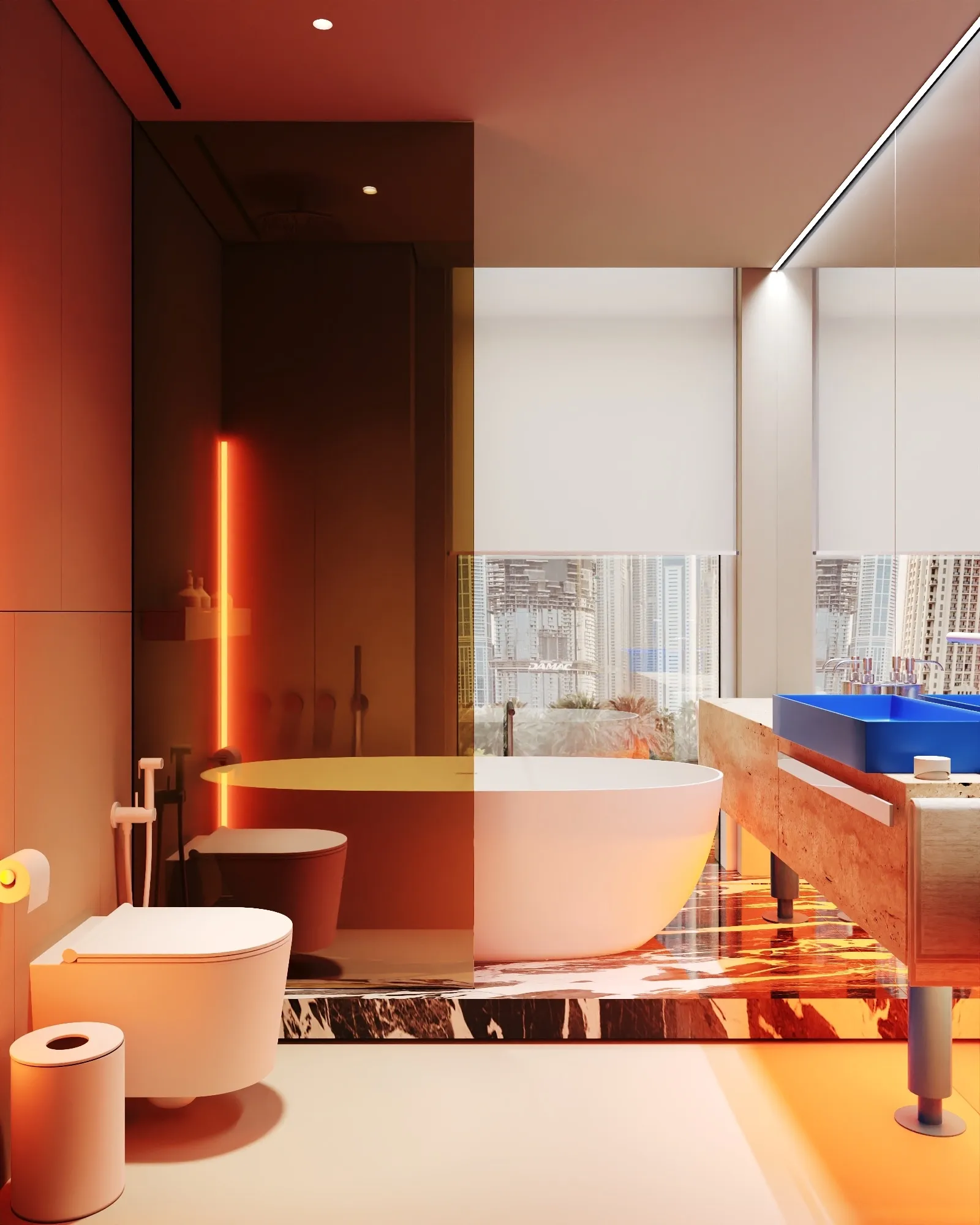 The interiors of Arsenal Dubai are characterized by a sophisticated blend of textures and materials, including polished concrete surfaces, striking marble elements, and warm layered lighting that enhances the architectural atmosphere. Custom-designed furnishings, sculptural decor pieces, and vibrant color accents contribute to a curated, design-forward environment. The project uses a mix of sleek built-ins, high-quality finishes, and expressive artistic elements.