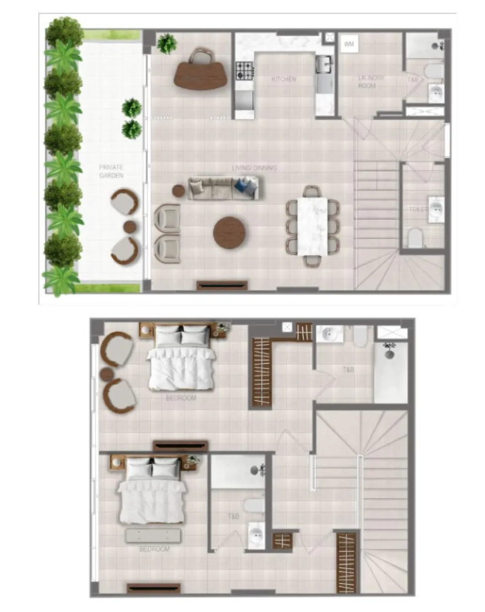 Interior spaces are composed with soft, modern palettes and premium finishes that echo the project’s fluid design language. Large floor-to-ceiling windows welcome natural light, while refined surfaces and clean architectural lines enhance the overall sense of calm. Kitchens are delivered with contemporary fitted cabinetry and high-quality materials, designed to complement the minimalist aesthetic.
