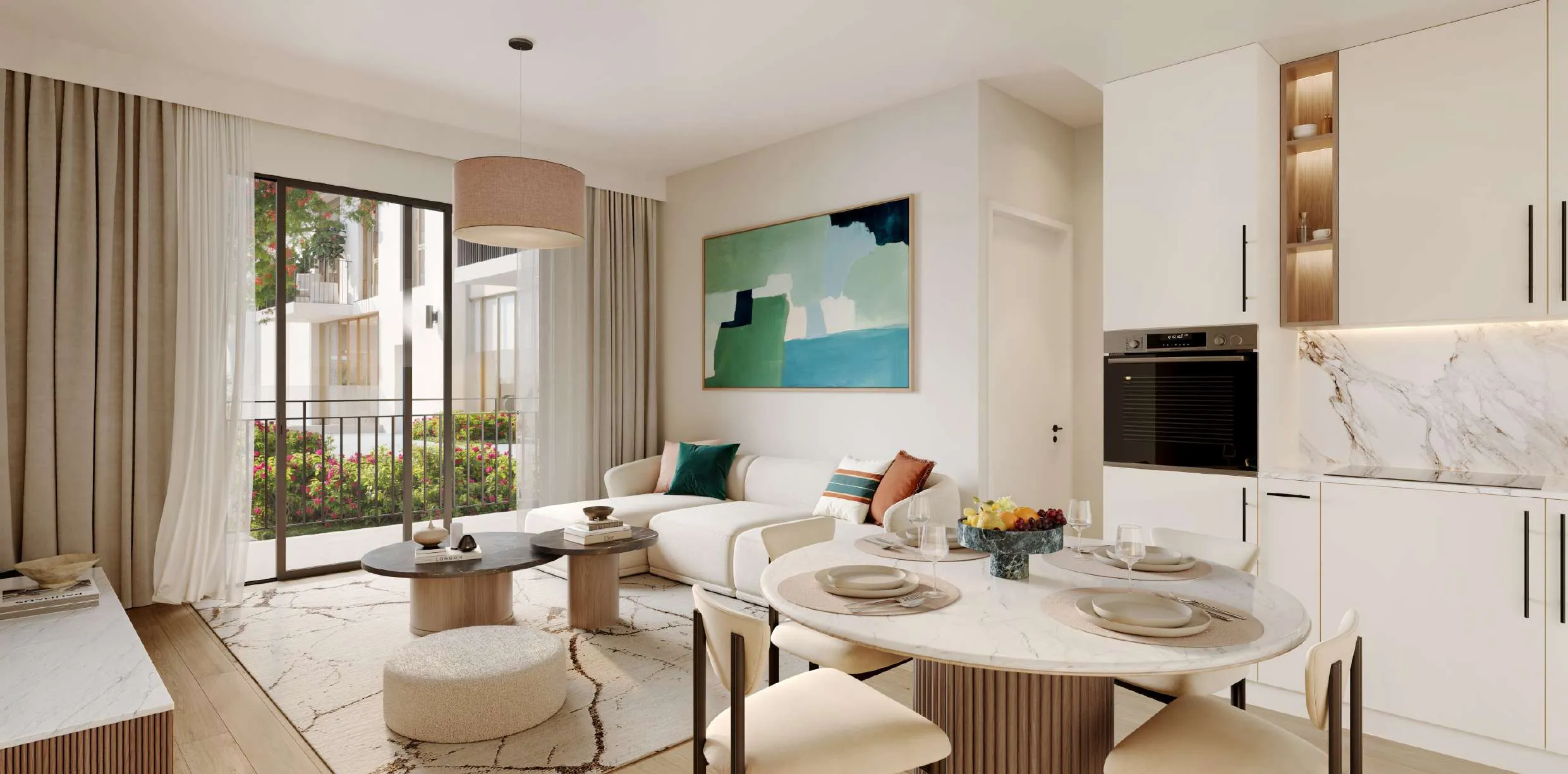 Inside the apartments, the interiors are elegant, functional, and finished to a high standard. Open-plan layouts, soft natural light, and refined materials create a sense of space and understated luxury throughout each home. Fully fitted and well-crafted kitchens with branded appliances offering a timeless look that combines comfort, quality, and everyday ease.