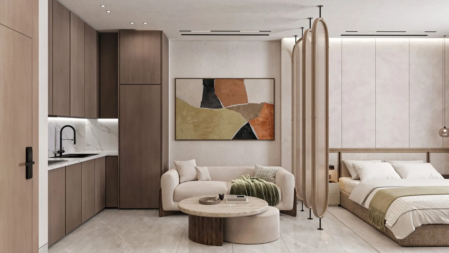Interiors at AB Hills feature modern, high-quality finishes with a neutral, timeless palette. Materials include large-format floor tiles, textured wall finishes, and floor-to-ceiling windows that enhance natural light. Kitchens are equipped with built-in cabinetry, stone countertops, tiled backsplashes, and integrated kitchen appliances. The apartments are semi-furnished, with fixed joinery and kitchen appliances included, while allowing residents flexibility to personalize living and bedroom spaces.