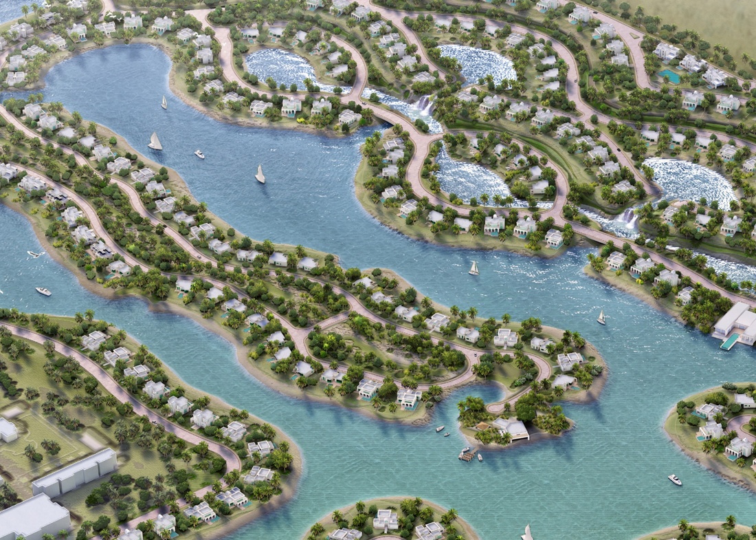 Water sports facility, walkways, lush landscaping